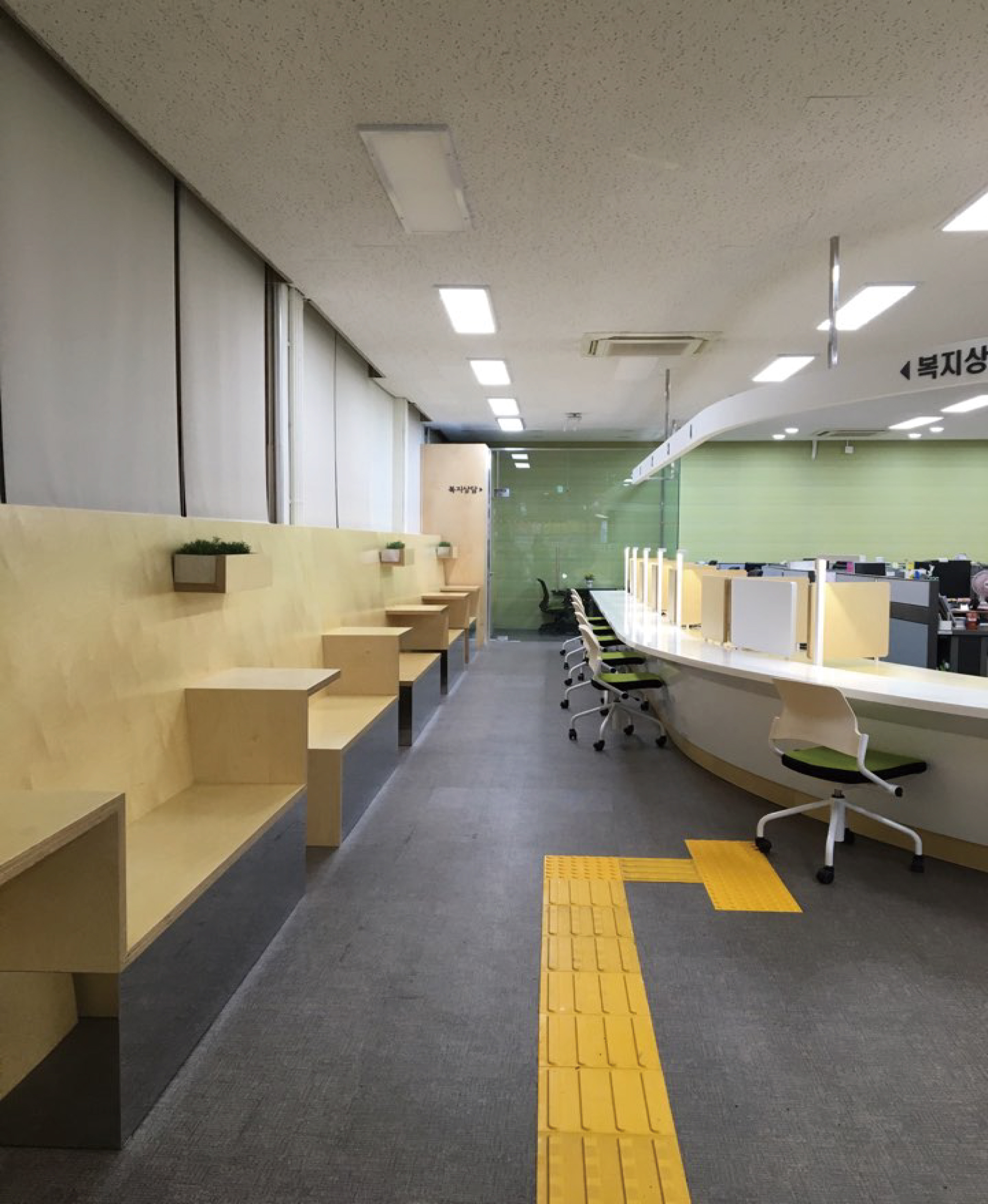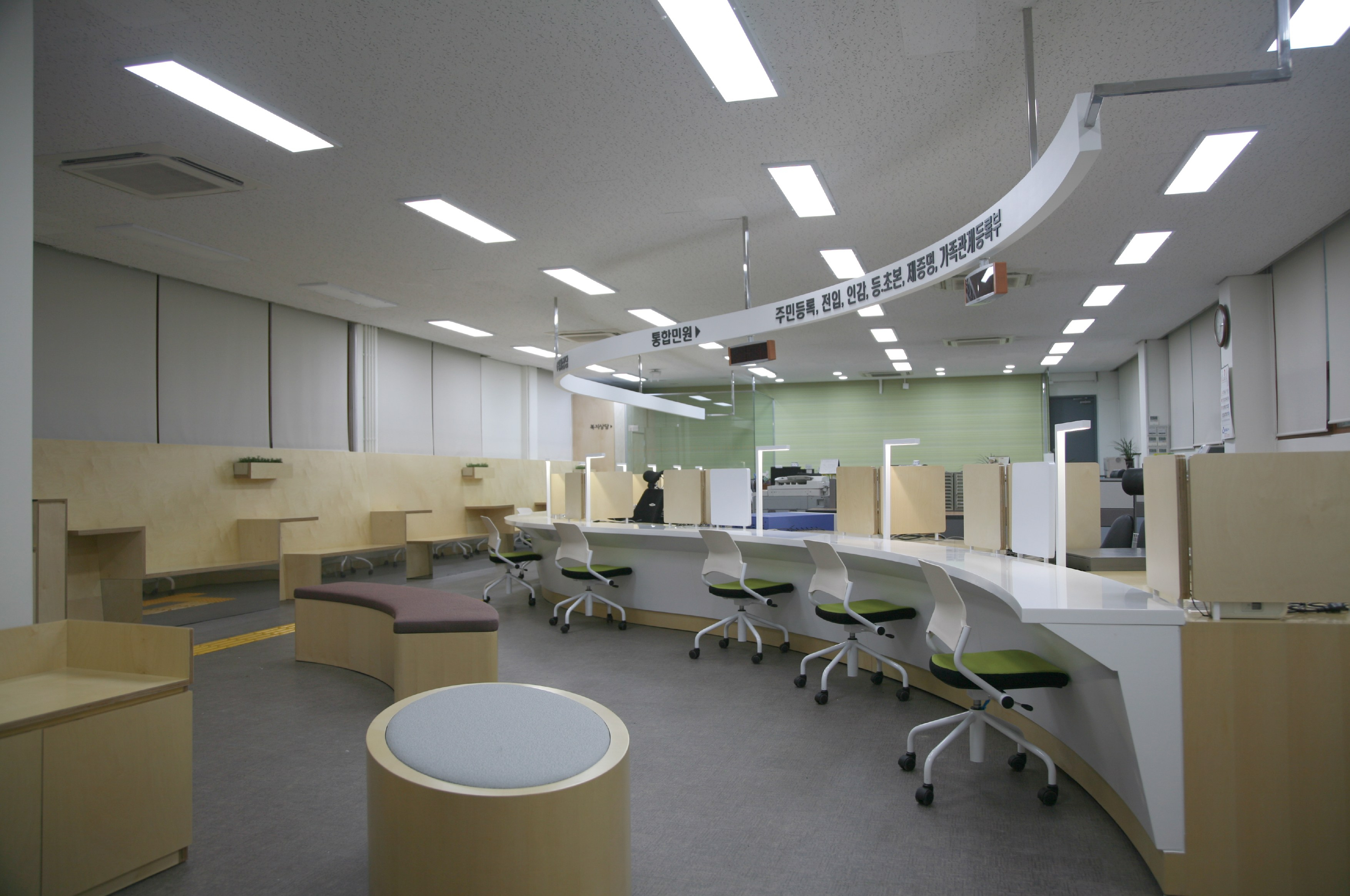 기존 건축물이 가지고 있는 원형공간을 활용하여 자연채광이 유입되는 쾌적하고 넓은 민원대기공간 조성하고 상담인원 증원계획에 따른 합리적 대민업무공간 확보하기 위해 길쭉한 평면을 이용한 행정팀 대민공간과 복지상담대민공간을 다른 방식으로 연속하여 분리와 통합된 형식을 취했다.