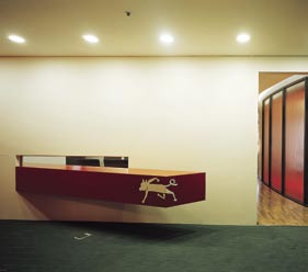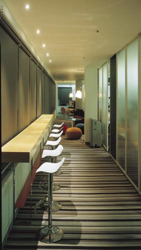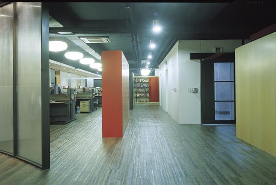 Except for rooms requiring soundproofing, the whole floor is open and divided by flexible partitions that were used as design elements. The space design was intended to provide “resting place” enabling “change of thought” that intervenes with the office space rather than to make a place for constant concentration. The objective was to utilize the resting time. Shift to a different place brings about change of thought, through which agile ideas can be captured. Combining working place and resting place was actually an experimental attempt for deriving the maximum efficiency in working hours. This is designed