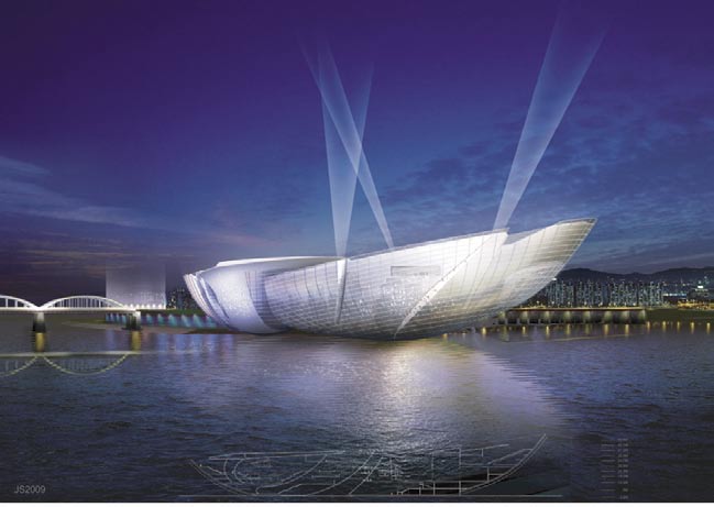 You will associate it with slipper-animalcule. The shape of The Nodeul Island is similar to a slipper-animalcule. Indeed, the Nodeul island has not allowed any other form of architecture until now due to this peculiar shape. Also, the volume of the building to be built was somewhat bigger than the size of the island, as it was an opera house.