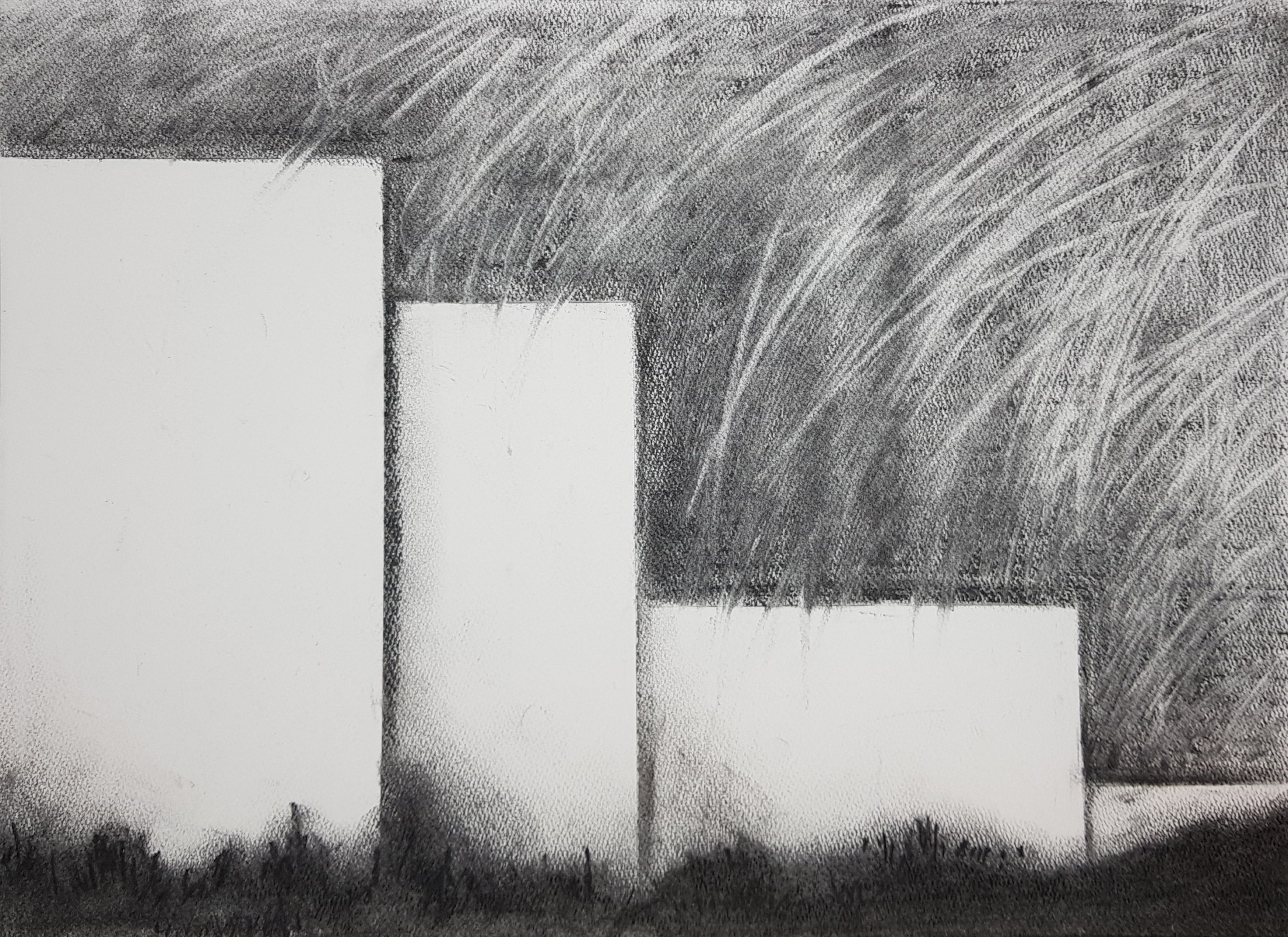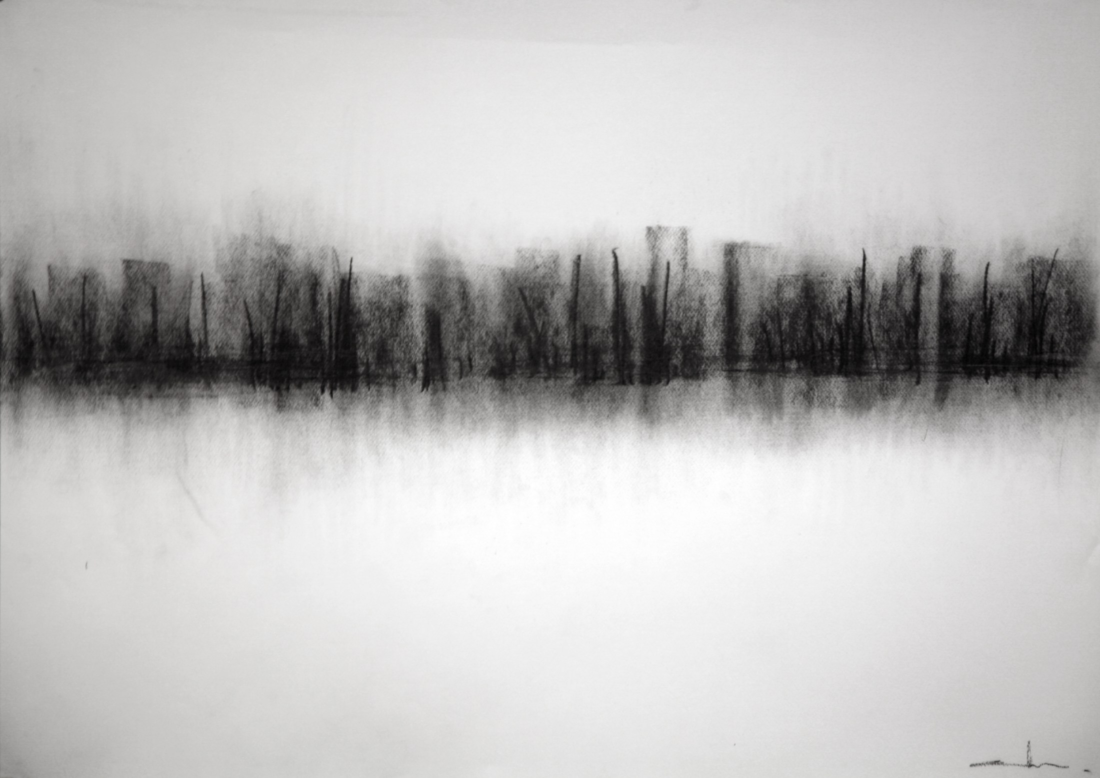 109×78 cm. charcoal on paper, 2016. “서울의 가로 축, 강변도로를 따라 달리다 보면 강 건너편 강을 따라 쭉 늘어선 아파트들이 보인다. 한강변 풍경이다.문뜩 그 건물들 사이사이에 있는 나무들이 거대하게 자라 아파트 사이에 가득하고아파트들은 흐릿해져 그 또한 굵어진 나무들이 되는 상상이 차창밖으로 스쳐 지나간다.그런 도시숲이 차와 함께 달린다.”